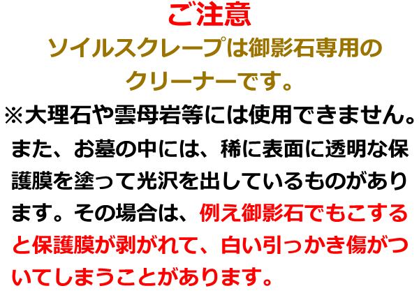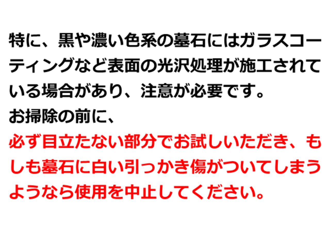御影石ではないお墓、または何らかガラスコーティング等が施工されているお墓に誤って使用すると白い引っかき傷がついてしまう場合があります。
