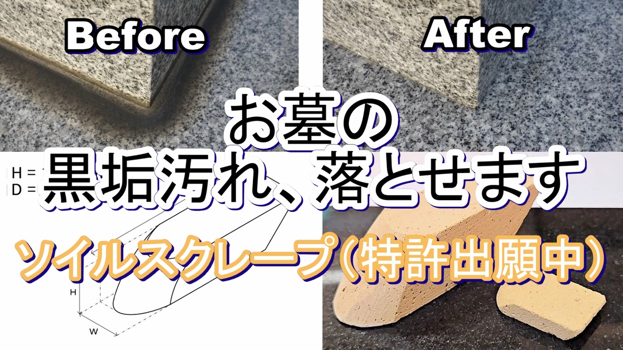 今までタワシで擦っても洗剤をつけてスポンジで洗っても落とせなかった、お墓(御影石)の焦げたような黒ずみ汚れ。柳沢石材が開発した専用クリーナー「ソイルスクレープ」で軽くコスれば、お墓を傷つけることなく簡単に落とせます。
